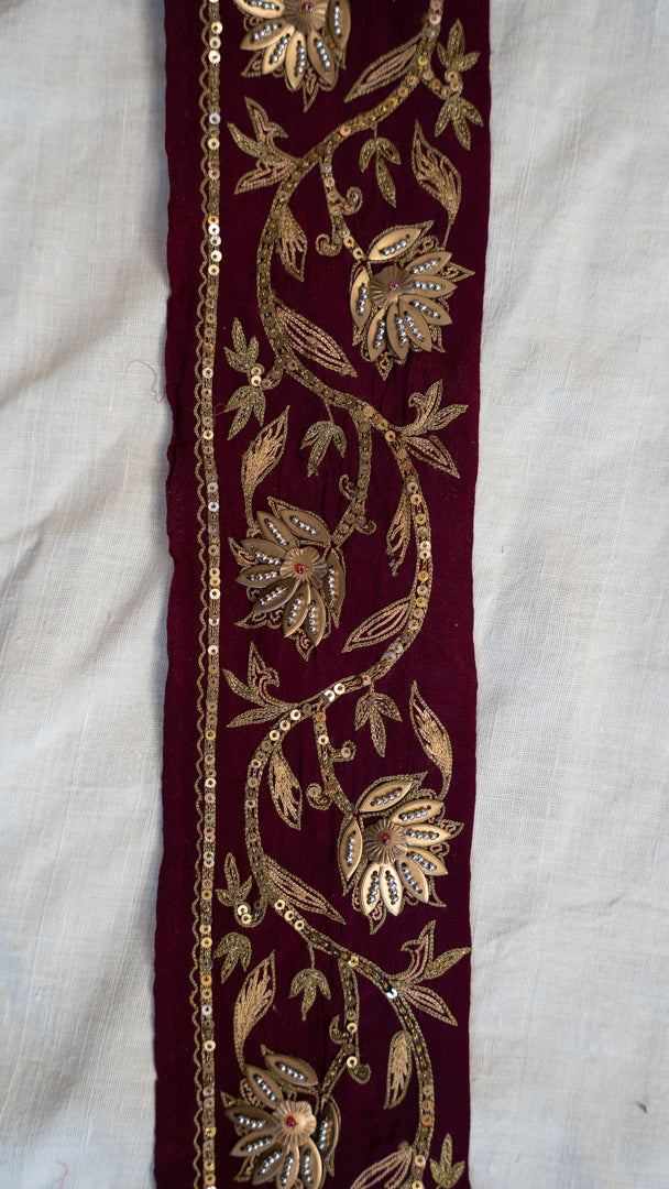 Vintage hand embroidered sari borders, consciously sourced in India in the little shop of my fav sari border man Vikas when I was traveling India myself. When a sari is outworn, they cut off the embroidered parts and resell the border. These embroidered ribbons were once hand stitched along the edges (borders) of a sari. Hand stitching results in a unique piece of work every time it is created. Even if the exact pattern and thread colors are replicated, there will be subtle differences in the way the stitches are made. This means that every piece of embroidery I use for mvdrl items are one of a kind and there is only a max. of 8 meters to be found in this world. You can recognize hand embroidery by checking the back of the border. If the knots from the stitches are not perfectly uniform, you know it is hand embroidered and not machine made. A true form of art if you ask me!