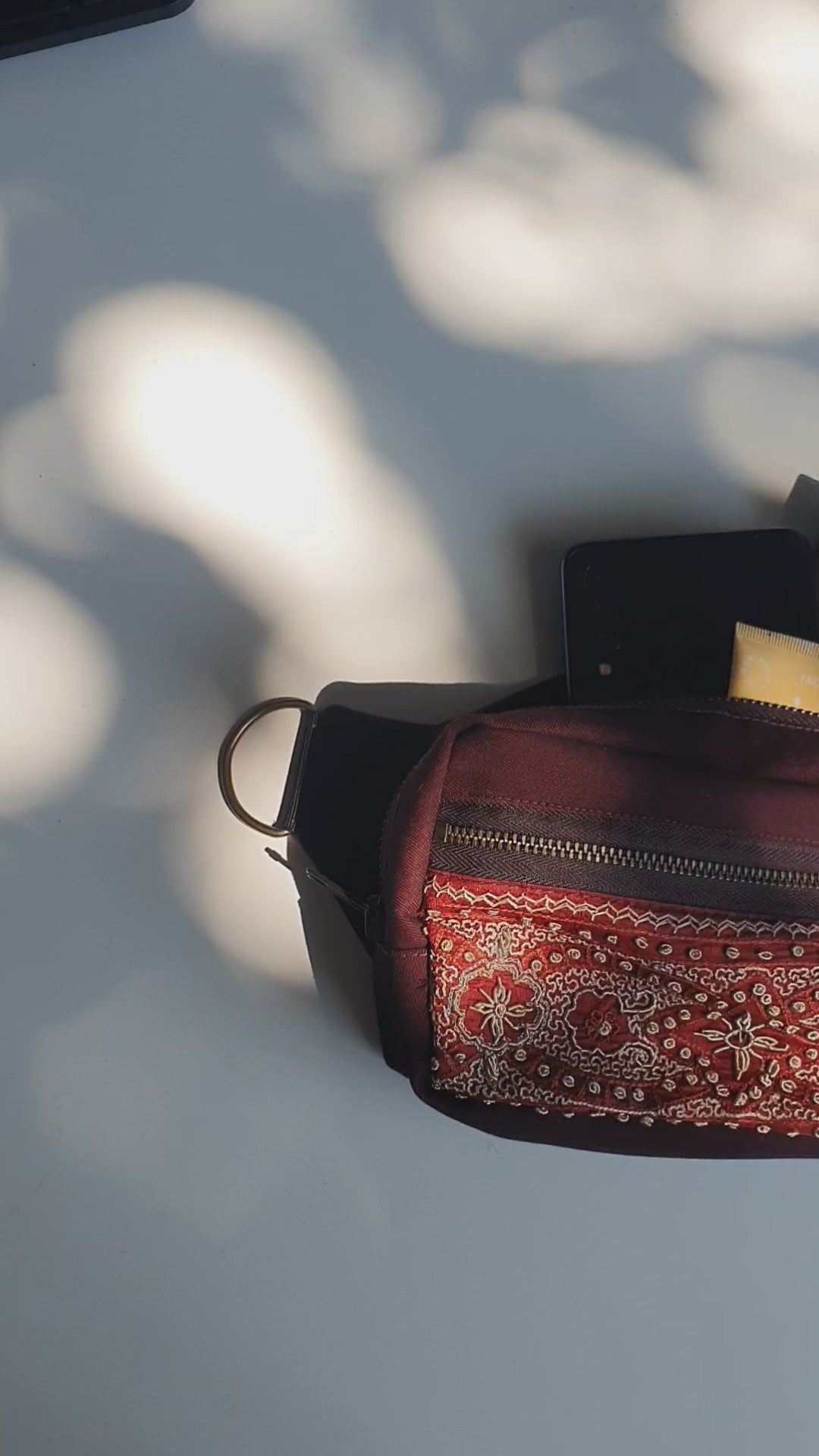 Crafted from used materials and made per order by Marijke, this bag is designed for festivals, adventures and everyday life. With two compartments, it easily fits your passport, any phone, your sunscreen and more!